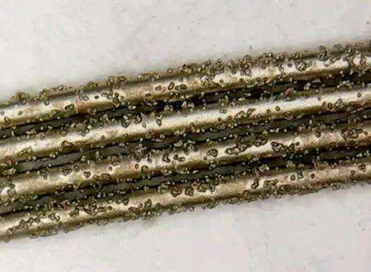 此类金属锯线产品通常由高速钢、碳素钢、合金钢等贱金属为基线,将石英、金刚砂、刚玉等磨料通过气相沉积及高温反应实现磨料与基线的结合,使用时将锯线置入显示切割机内用于光伏、电子和珠宝等行业的都硬质材料切割。其主要表观特征为在基线上有不规则颗粒状凸起,明显可见为两种材质结合而成。