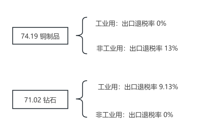 在品目74.19中,工业用的铜制品出口退税率是0%,而非工业用的铜制品出口退税率则为13%;在品目71.02中,工业用钻石出口退税率是9,13%,而非工业用的钻石出口退税率为0%。由此可见,如果相关产品归类错误,后果将不堪设想。