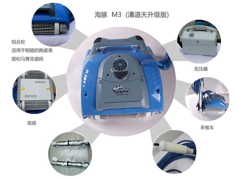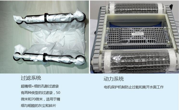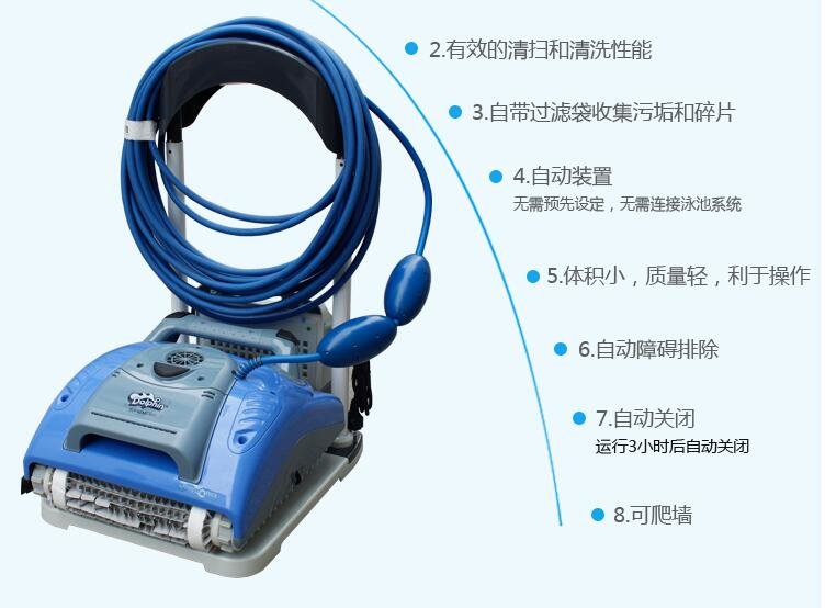 该商品可自动地对游泳池底或池壁上的较大颗粒的污物,以及泳池清洗机主机底部与泳池底或池壁之间的水层中较大颗粒的悬浮物进行清理。整个过程为全物理清晰,不需要添加任何化学药剂。该装置必须在行进中清洁,且泳池无水时该装置无法工作,它可以在平面上运动,也可以爬坡。这种设备体积较大,一般家庭泳池很少用,通常适用于公共游泳池的清洁。