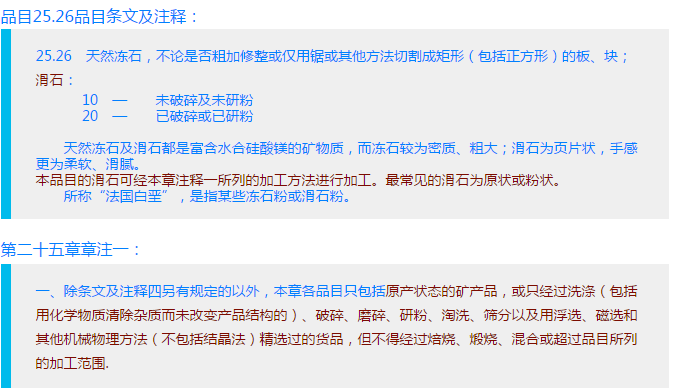 1、对于天然滑石矿物,符合品目25.26规定的,应归入品目25.26项下;