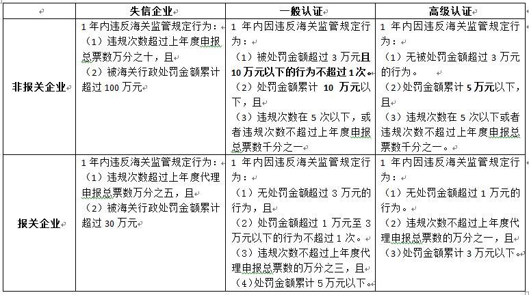 关键字 我们在上述行政处罚的要求中应当特别注意关键字的运用,我们以进出口货物收发货人的高级认证标准为例。在这里,不允许出现一次行政处罚金额超过3万元的行为;如果虽有行政处罚,但是处罚金额每次都未超过3万元,那么则可以从低对碰两个条件: a. 累计处罚金额在5万元以下且违规次数在5次以下, b. 累计处罚金额在5万元以下且违规次数不超过上年度申报总票数的千分之一。 因为a和b之间是或的关系,所以这两个条件任何一项可以满足,企业都不至于被降级。 降级要求 如某高级认证企业收到海关行政处罚不满足高级认证标准但未超过一般认证标准,则降级为一般认证企业;如既不满足高级认证标准又不满足一般认证企业标准则降级为一般信用企业;如达到失信企业标准则一降到底。 其实看起来上述a.款的标准很难达到,但是上述b.款又比较容易实现,但是果子并不这么认为。因为b.款除了要求处罚金额不超过5万,还要求违规次数不超过5次,这意味着即便每次处罚都不足1万元,但是处罚次数达到6次也要被降级。同时,还有不超过千分之一的要求,那么如果行政处罚5次,就意味着上年度报关单量必须超过5000票。就报关单量一项,基本上没有哪个收发货人可以满足的了!! “1年内”的计算方法 《海关企业认证标准》中的“1年内”,如遇企业信用等级向下调整的,以最近一次海关行政处罚决定作出之日倒推12个月计算。换言之,企业不可能在发生行政处罚之后以拖延认证时间的方式来满足认证标准。 还是来举例说明:某公司2018年5月被海关行政处罚1万元,2019年3月被海关行政处罚5千元,该企业于2019年10月向海关申请AEO高级认证。此时,海关将以2019年3月最近一次行政处罚决定书签发之日起倒推一年,计算出累计处罚金额为15000元。