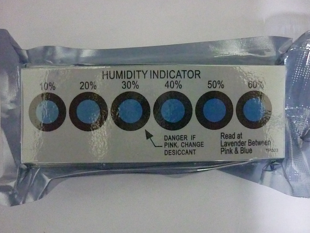 湿度指示卡是一张带有能变颜色的圆圈点的卡片,使用者可通过圆圈点的颜色变化轻易地辨别密封容器或密闭空间内的环境湿度及其内干燥剂的使用状况。当湿度显示卡上的颜色由蓝色变为粉红色时,既可知包装容器中的湿度是否已高达损害物品的程度,或包装容器是否失效。 湿度指示卡具有使用方便,易于观察,指示范围较大的特点,并且使用后的湿度指示卡在温度为80℃的环境中放置5-6分钟,其指示圆点颜色会恢复成原来的蓝色,可重复使用,经校准过的灵敏指示成分可使灵敏度固定在相关湿度的百分之五范围内。