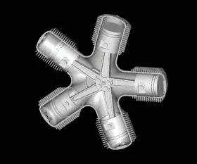 这一种气缸环绕曲轴呈星型排列的一种活塞式发动机,工作是每个气缸轮流做工,一般是基数个气缸(如下图),可靠性高,重量轻,就是大飞机用不了