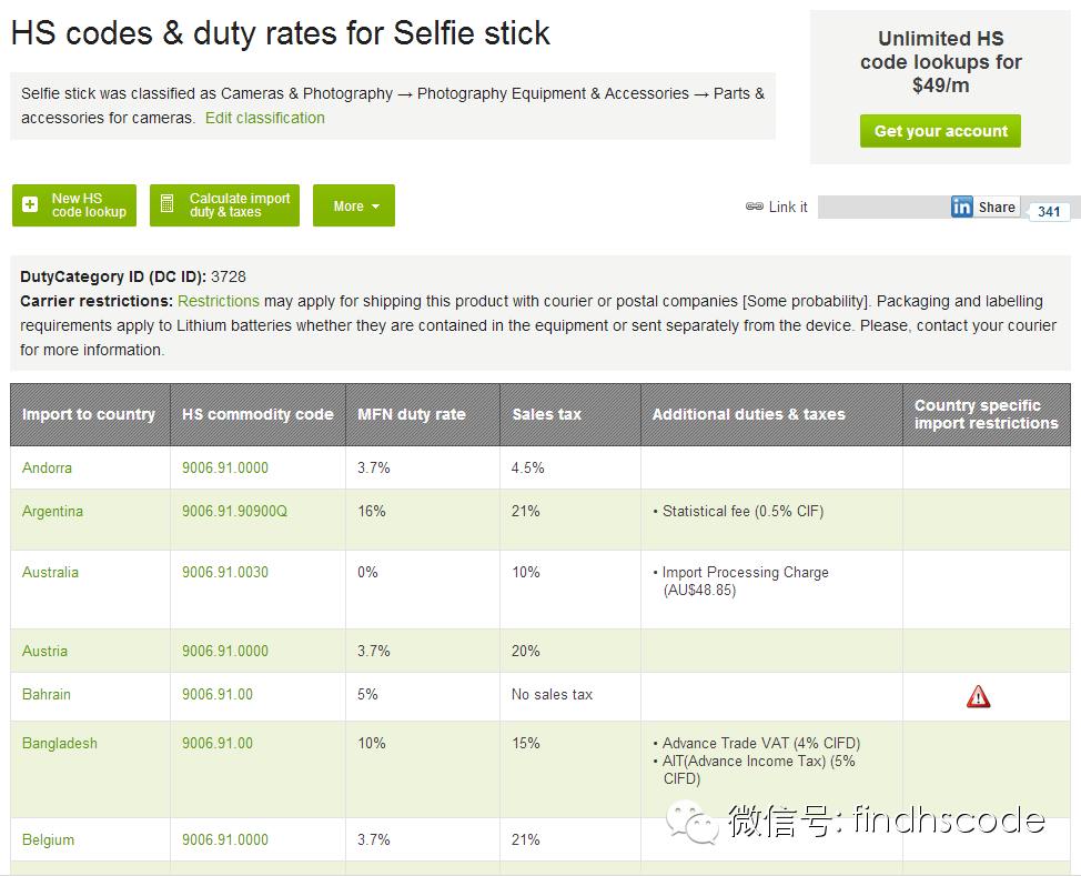 因此,目前主流观点认为,“自拍杆”应按照相机的“零件及附件”归入品目90.06项下。而且,在“DutyCalculator”网站中输入“selfie stick”也会跳出一长窜归入90.06的搜索结果(各个国家的都有)。