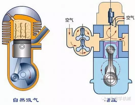 内燃机按照进气系统是否采用增压方式可以分为自然吸气(非增压)式发动机和强制进气(增压式)发动机。汽油机常采用自然吸气式;柴油机为了提高功率有采用增压式的。