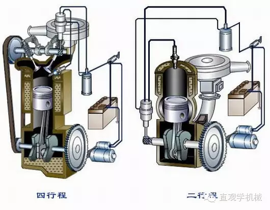 内燃机按照完成一个工作循环所需的行程数可分为四行程内燃机和二行程内燃机。把曲轴转两圈(720°),活塞在气缸内上下往复运动四个行程,完成一个工作循环的内燃机称为四行程内燃机;而把曲轴转一圈(360°),活塞在气缸内上下往复运动两个行程,完成一个工作循环的内燃机称为二行程内燃机。汽车发动机广泛使用四行程内燃机。
