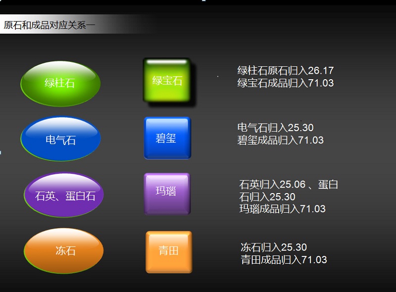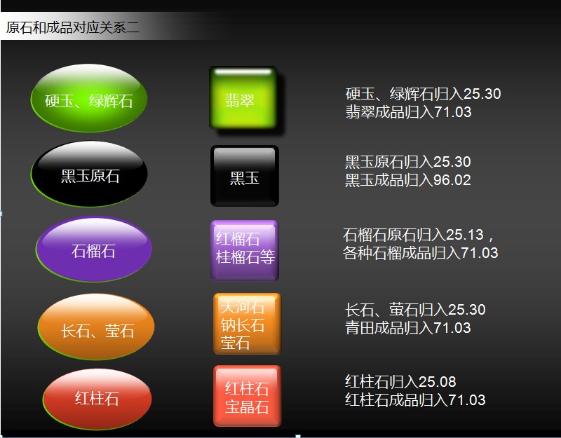 其成品翡翠归入71.03 ;黑玉原石归入25.30,黑玉成品归入96.02;石榴石原石归入25.13,各种石榴成品归入71.03 ;长石、萤石归入25.30,青田成品归入71.03;红柱石归入25.08,