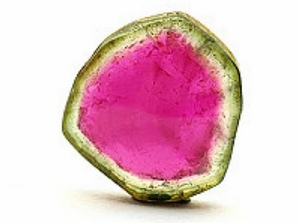 4.多色碧玺:由于电气石色带十分发育,常在一个晶体上出现红色、绿色的二色色带或三色色带;色带也可依Z轴为中心由里向外形成色环。