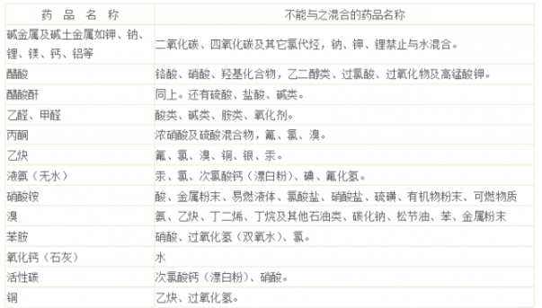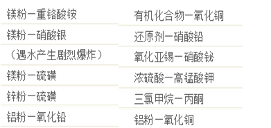 表1中列出的混合物都发生过意外的爆炸事故。表2为不能混合的常用药品。