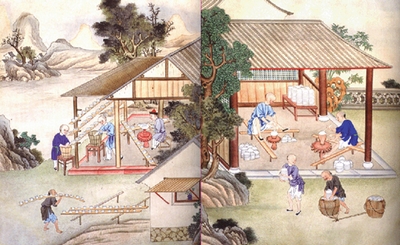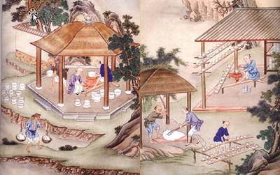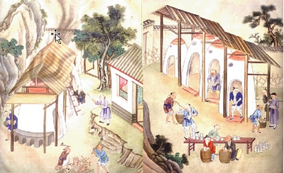 捺水、画坯和上釉:捺水即用清水洗去坯上的尘土,在坯上作画是陶瓷艺术的一大特色,画坯有好多种,是陶瓷工序的点睛之笔。画好的瓷坯,粗糙而又呆涩,上好釉后则全然不同,光滑而又明亮。
