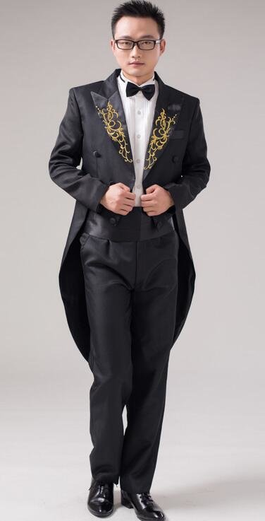 2、大礼服,也称晚礼服或燕尾服。上装为黑色,前摆齐腰剪平,后摆较长,成燕尾状。燕尾服配白色马甲,浆硬白衬衫、白领结,镶有两道丝带的黒裤,黒丝帽,黒条纹皮带,佩戴各种勋章和奖章。这种礼服只适合于非常正式的场合,如美国总统访问英国,英女王举行正式欢迎宴会时,宾主才穿。大礼服有时也用于白天室内的典礼活动,如向英国女王递交国书,外交使节需着这种大礼服。