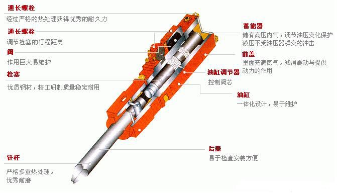 工作原理:在液压油的压力作用下,液压冲击器的活塞在其缸体内做高频率的往复直线运动,撞击钎尾,钎尾带动钎头和钎杆运动,从而开凿岩石。