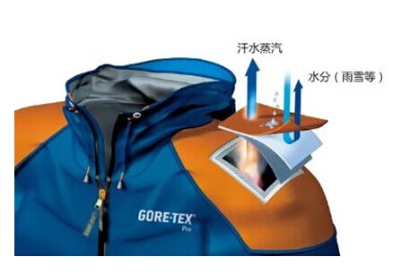 (1)一种是ePTFE复膜的微孔型面料,目前国内多是GORE-TEX、DENTIK、EVENT、3TO1-TEX这几种。它防水透气的功能是在服装的外面料上复合一层微孔薄膜,其中的微孔比水滴分子小,又比气体分子大,可以在阻挡雨水的同时挥发自身的汗气。