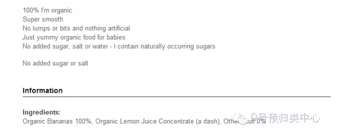 我们发现除基础成分香蕉之外, 含有的浓缩柠檬汁在这里起到调节口味和增加营养的作用,是允许添加的成分。那么这种产品就是我们品目20.07均化食品所描述的样子,不论是从成分、制作方法、适用对象还是零售包装的重量~ 这里虽然名字是均化食品,其实是将果实精细均化制成的。