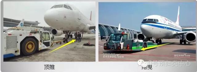 看到没有?很多同志都忽略了吧,这里的“牵引车”应更扩大范围到“牵引和推动”。从字面上很好理解,一个是拉另一个是推。换言之,不仅是拖曳动作的被视为协调制度中的“牵引”,就是顶推动作也是“牵引”的一类。比如在机场,我们经常听到“飞机已经推出”这样的对话,同时也可以看到拖曳动作,如下图: