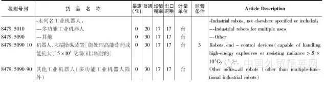 大家不妨看一下↑↑↑的众多机器人,有焊接机器人、搬运机器人、多功能机器人、削面机器人、服务员机器人、娱乐机器人。额,貌似企鹅也出了一个叫做小Q机器人的东东。如果我们抛开《协调制度》本身的规定,看起来可以按照用途分为工业机器人和民用机器人两大类。而更多的商品归类文章当中将其分为了工业机器人和特种机器人两类。本宝宝又郁闷啦~我们查看《进出口税则》后发现,仅在子目8479.5010中有 “多功能工业机器人” 的具体列名。