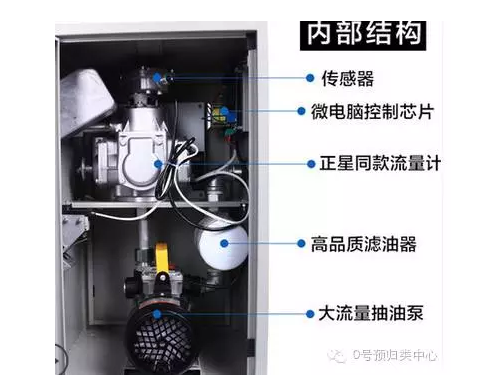 由图中可知,它的结构包括:油泵、流量计、微电脑控制芯片、打印装置、传感器等。