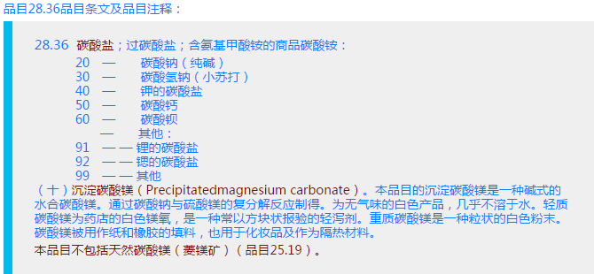 综上,该产品为100%碳酸镁构成,小编建议将其按碳酸盐归入税则号列2836.9910。