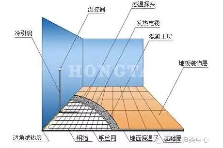 电地暖系统将热能储存在楼层之间,热效率基本为100%。它是由发热电缆、温控器,地面辅材。让小编为大家上张图片,可以看起来更直观些:
