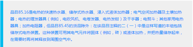 在该条注释中很明显品目85.09已经把电热器具排除在外了。那么接着我们看下品目85.16