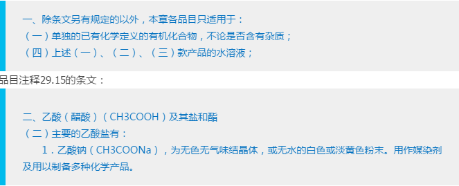 (品目29.15项下包括该产品的水溶液,具体请看第二十九章章注一(四))