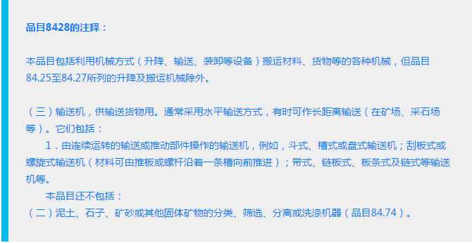 归类思路:从上面的工作原理及安装示意图可以看出这个自动猫厕所主要是由一个可转动的传动带组成,传动带中间有缝隙可以过滤掉没有结团的猫砂,把有结团的猫砂传送到废物盒中。所以这个自动猫厕所最主要还是输送功能。那么它可以归到品目8428的输送机吗?查阅了84章章注及类注并没关于这个产品的排他条款。