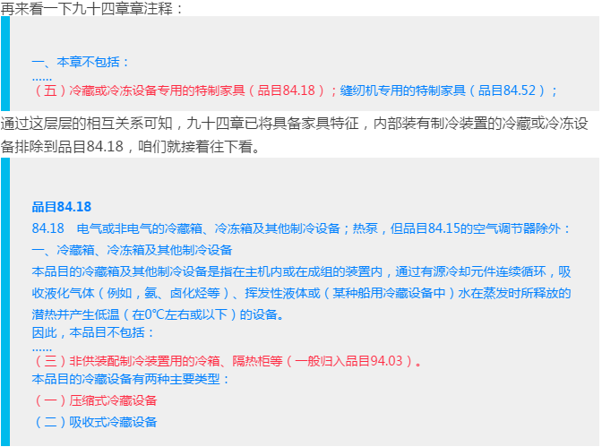 解决完品目94.03的疑惑,接着研究“Chill”。它的冷藏温度范围为2至8℃,机器内装有压缩机、蒸发器、冷凝器等,满足九十四章的排除条款的描述,是可以归入品目84.18的,但是具体归入品目84.18下的那个子目呢?是应该按压缩式家用冷藏箱归入品目
