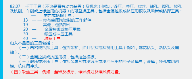 首先我们先来看品目82.05,品目82.05的产品要包括可直接使用或装手柄后即可使用的手工工具。其实从这里我们就大致可以分析出,品目82.07则是不能单独使用的手工工具,但是这些手工工具可以安装于“第八十四章注释七规定归入品目84.57至84.65或84.79的机床”,比如:凿岩或钻探工具、金属拉丝或挤压用具、锻压或冲压工具、攻丝、钻孔、镗孔或铰孔工具、铣削、车削以及其他可互换工具。