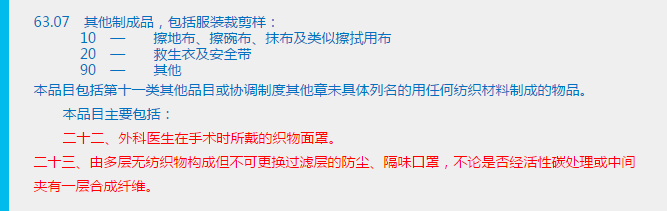 好了,3M口罩的一些小知识就先给大家介绍这么多,回到正题,在归类的方向中上述的口罩到底归入哪个品目呢?有的同志就会说归在第六十三章啊,在品目63.07的注释中有提到的: