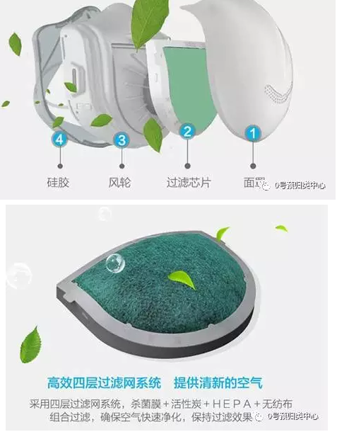 说道这里,小编第一次见到还有这样的口罩,于是激起了小编的归类情绪,非要研究研究这是啥子玩意儿。皇天不负有心人,查找相关资料后发现阻隔PM2.5关键在于滤芯材料,只用活性炭或棉布,纯属心理安慰,过滤0.3微米下的颗粒只有通过HEPA才可过滤。该口罩内不仅有HEPA滤芯并且内置4叶涡轮风机避免二次污染利用风力产生气压,通过导流槽将废弃从下方废气孔排出。